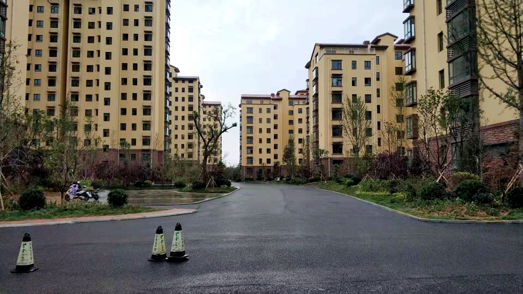 圖為用招和環(huán)保建材公司生產(chǎn)的透水瀝青施工的格林小鎮(zhèn)六期街道現(xiàn)場(chǎng)。