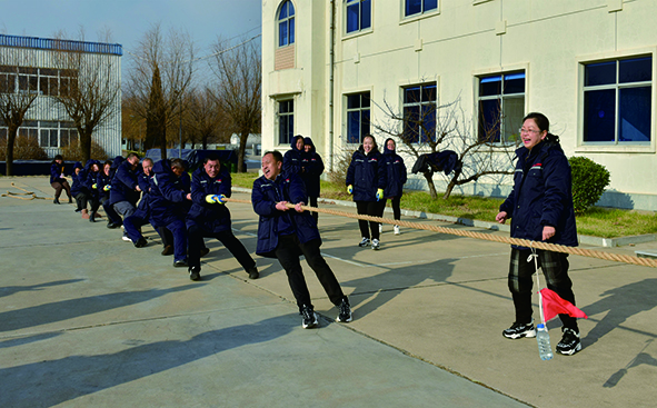慶祝大會之后,金潮股份公司副總裁苑永海、財(cái)務(wù)中心及行政人事中心負(fù)責(zé)人與果蔬公司全體干部員工在辦公樓前拍了廠慶“全家?!?。上午9點(diǎn)多鐘,廠慶體育比賽活動在辦公樓門前如期舉行。男女混合拔河、集體綁腿行走、背氣球等趣味體育比賽活動陸續(xù)展開。干部員工踴躍參與,比賽現(xiàn)場氣氛熱烈,吶喊助威不絕于耳,“加油”聲此起彼伏。“兩軍對壘”的“拔河”比賽構(gòu)成一幅“力拔山兮氣蓋世,同舟共濟(jì)譜新篇”的壯闊畫面。集體行走更是別具一格,各部門男女選手搭配3人一組,用紅色彩綢將腿綁在一起,大家步調(diào)一致,闊步前行,演繹了一曲“步調(diào)一致才能贏”的和諧旋律。