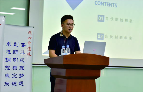 三位貴賓圍繞“合伙制”,依次進(jìn)行了精彩的主題宣講。同濟(jì)大學(xué)經(jīng)濟(jì)學(xué)學(xué)士,哲學(xué)碩士,管理學(xué)在讀博士程宇銳宣講的主題是《合伙制的初衷與未來(lái)》;金柚網(wǎng)人力資源外包濟(jì)青分公司總經(jīng)理李亞?wèn)|講述了自己曾經(jīng)就職于海爾集團(tuán)、阿里巴巴、韓國(guó)三星等國(guó)內(nèi)外著名 企業(yè)的職業(yè)歷程和職業(yè)規(guī)劃;北京德和衡律師事務(wù)所楊振偉律師為公司未來(lái)合伙制的落地實(shí)施,做了進(jìn)一步的遠(yuǎn)景鋪墊。宣講培訓(xùn)結(jié)束后,由行政人事總監(jiān)公布了合格合伙牽頭人候選人名單,以及后續(xù)合伙制方案公布的有關(guān)事宜。