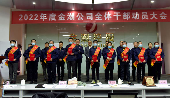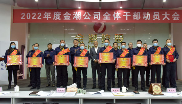 公司行政人事負責人王璐首先宣讀了“2021年度特殊重大貢獻獎、紅旗單位、先進團隊、勞動模范、優(yōu)秀干部、先進工作者的表彰決定”。隨后,公司董事長程紹華宣讀了“關于對曹雪松特殊重大貢獻獎表彰的通報”,并依次為特殊重大貢獻獎獲得者曹雪松、紅旗單位獲得企業(yè)金潮地產(chǎn)公司頒獎并合影。伴隨著歡快的《步步高》樂曲,公司領導先后為獲獎的先進團隊和先進個人頒發(fā)了獎狀和證書。1時48分,在熱烈的掌聲中,總裁程紹華作了題為《風雨同舟鑄輝煌 和衷共濟創(chuàng)未來》的2022年度金潮公司全體干部動員大會報告(全文已發(fā))。簡要回顧一年來公司的主要工作亮點,明確了2022年改革發(fā)展的方向和思路,對各企業(yè)“合伙制”團隊提出了九項建議和要求,并展望了未來金潮改革發(fā)展的美好前景。