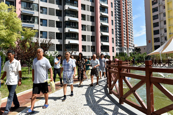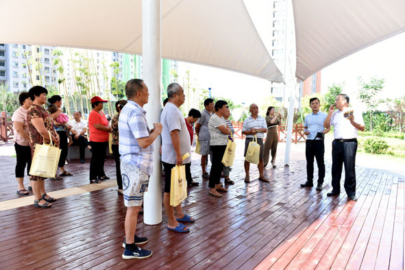 8月22日,前幾天的夏雨過后,藍(lán)天白云下的金奧國際城綠草如茵,潔白的張拉膜映襯著中心景觀水池中的噴泉,睡蓮花靜靜綻放,抱著孩子的媽媽、推著童車的老人……整個小區(qū)一片祥和安寧。上午9點(diǎn)多鐘,金奧國際城項目迎來了一批特殊的客人,他們是單家村的黨員、村民代表和待拆遷安置的村民。他們來到小區(qū),走在景觀里、大樹下、漫步在木棧道上、水池邊,親身感受著小區(qū)的綠化景觀和他們能夠觸摸到、享受到的美好生活。